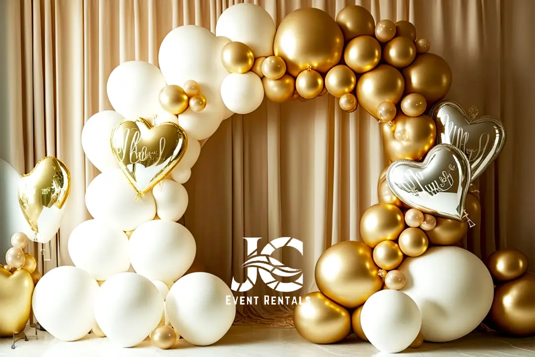 At JC Event Rentals, our balloon decoration rentals transform any venue into a festive and stylish environment that delights every guest. From elegant arches and creative balloon walls to playful bouquets and centerpieces, our designs bring color, dimension, and personality to weddings, birthdays, corporate gatherings, graduations, and community celebrations. Golden balloons add a glamorous and modern touch, making your event feel truly special and unforgettable.