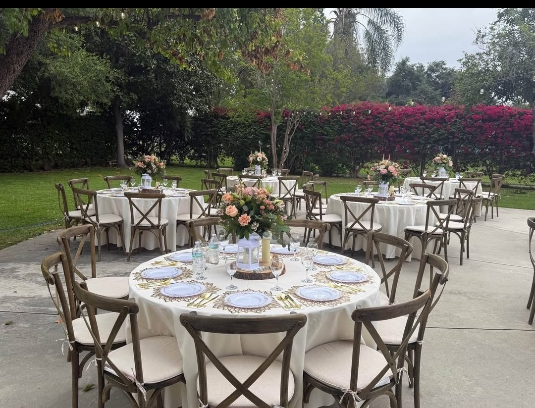 Our cross back chairs pair beautifully with our farm tables, round tables, and other rustic décor elements to create a cohesive, Instagram-worthy event setup. Available for delivery throughout Orange County including Mission Viejo, Dana Point, Laguna Beach, Newport Beach, and surrounding areas.