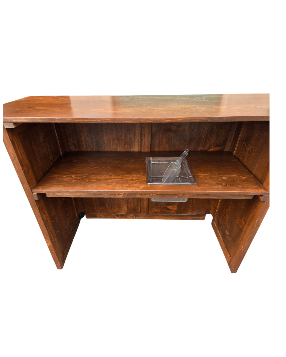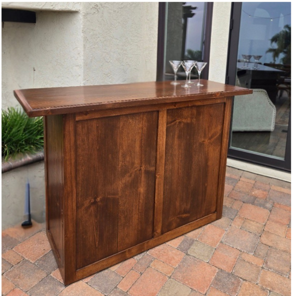 Bring a warm, elevated look to your event with our 5-foot rustic wood bar. Finished in a rich stained wood tone with a clean, classic design, this bar creates an inviting focal point for cocktail hour, bartender service, or a stylish beverage station.